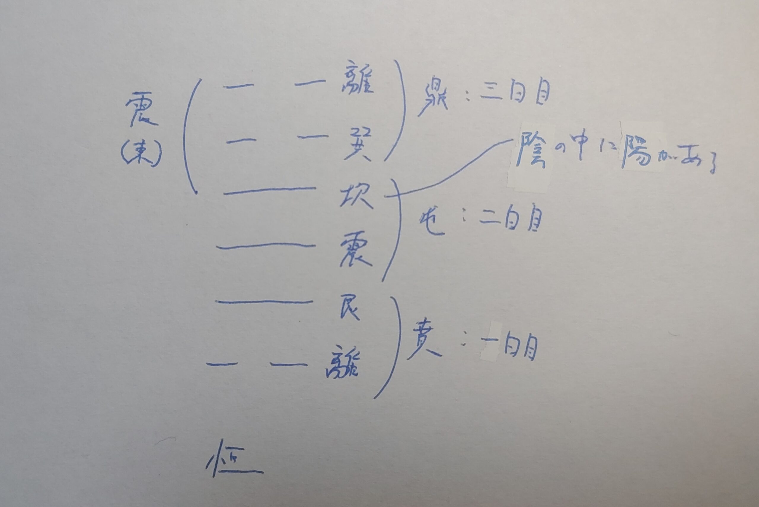 爻には、もともと陰陽の性質があるのですが、“爻ごとの陰陽は、じつは八卦の性質を帯びている”というふうに真勢中州はしています。