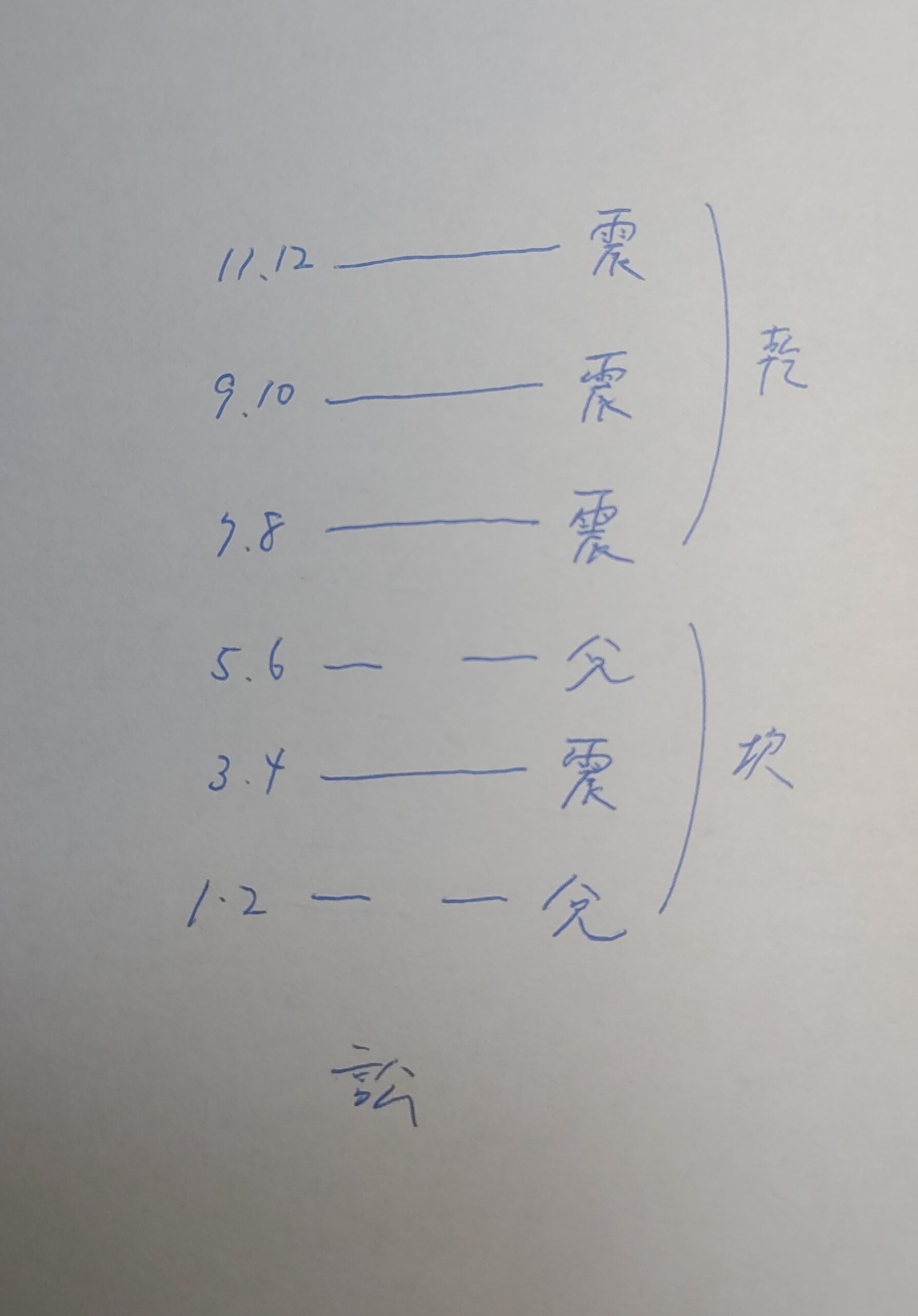 なので、陽爻は乾・震・坎・艮、陰爻は坤・巽・離・兌にわかれていて、しかも成熟した陽爻(乾)&成熟した陰爻(坤)は変爻になっている――としています。(“爻ごとの卦”なので「爻卦」と云います。出し方は、八卦を六回出せばOKです)
