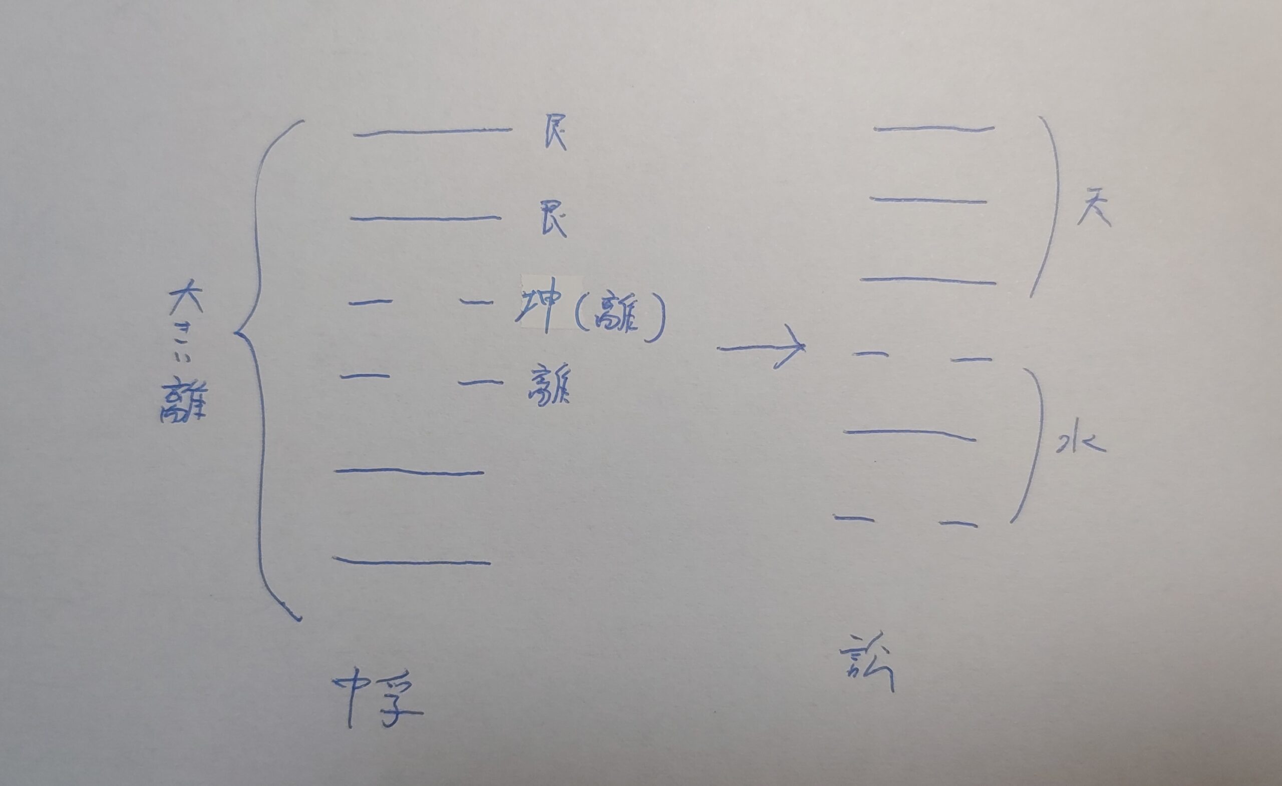占ってみると、中孚之訟が出た。真勢中州は「風沢中孚は、二爻ずつセットでみると大きい離になっている。しかも、三爻(大きい離の卦主)には爻卦 離が入っている。なので、四爻の陰爻もどうやら離を兼ねているらしい。
