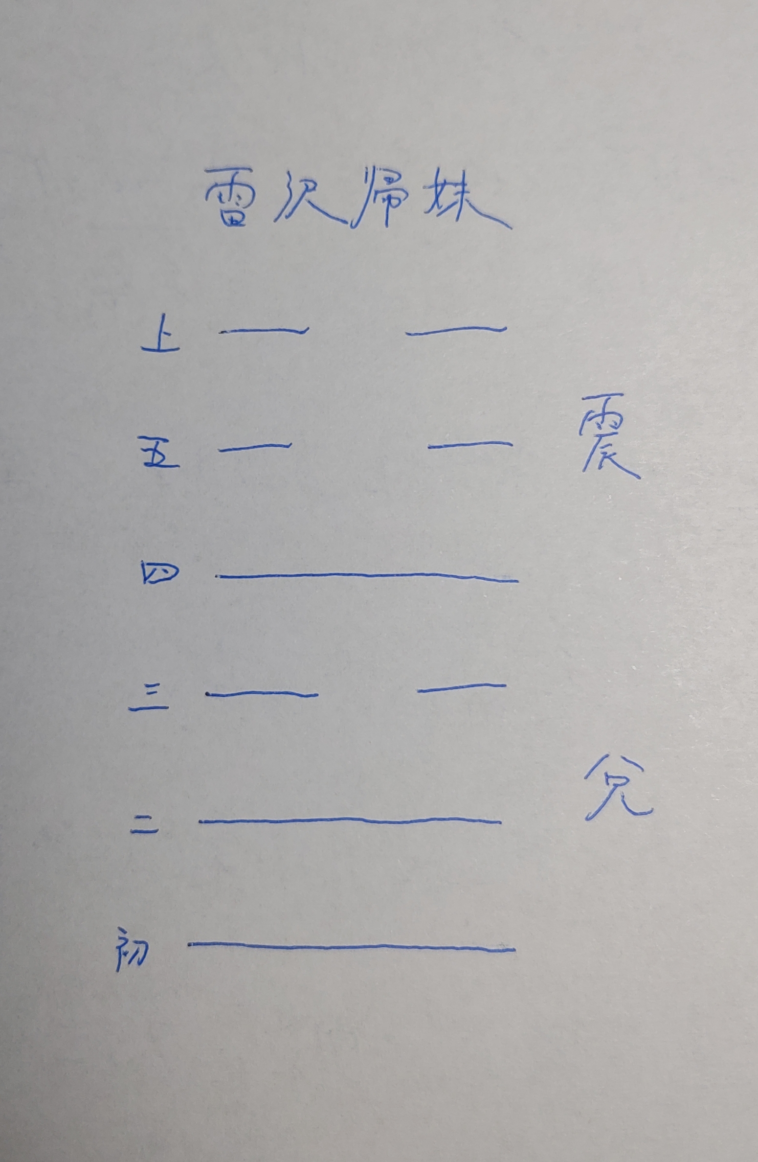 なので、帰妹は八卦どうしの組み合わせでみていくと「嫁いでいく幼い妹を喜ばせるために動く(兌:幼い妹の喜び、震:動く)」みたいな感じで、それなりに成り立つようにもみえるし、爻の関係でみてしまうと二~五爻の配置がすべて正ではない&陽を押し潰すように陰気が垂れこめている不穏さ――みたいにもみえます。
