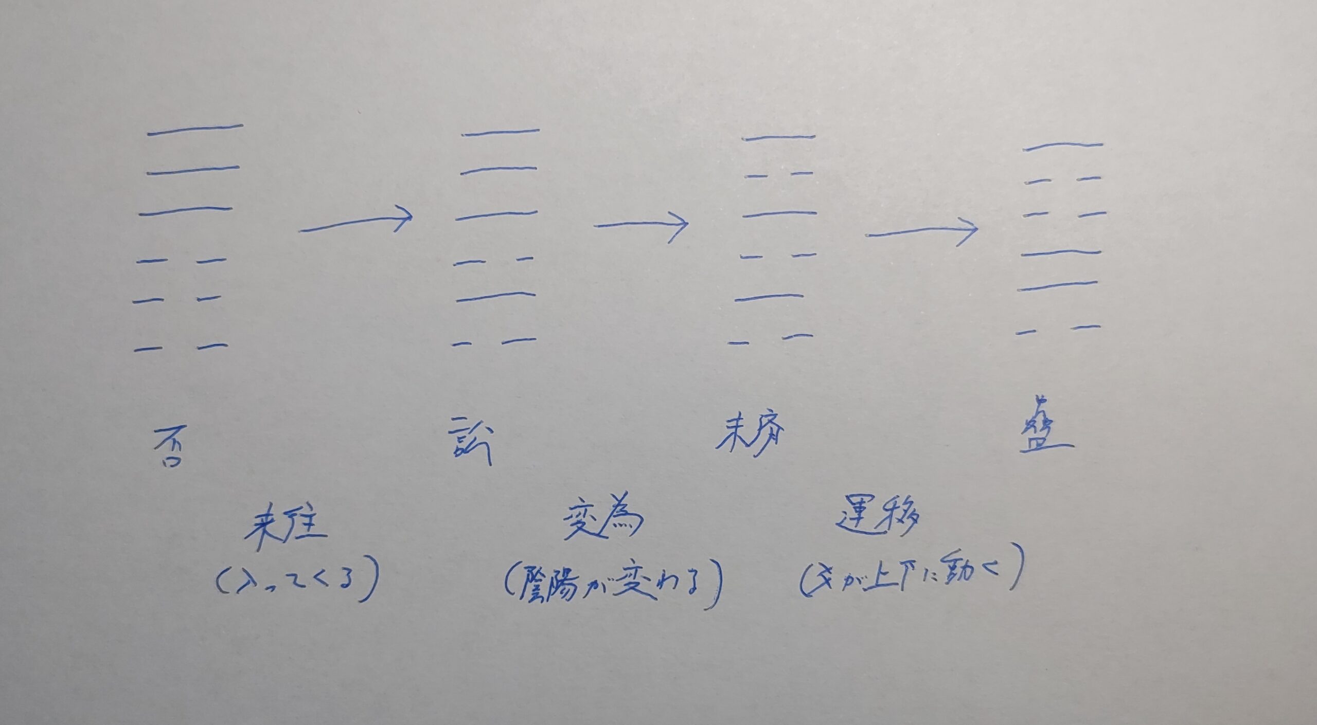 つづいては、運移生卦です。こちらは、ある爻が上下に動いた様子を感じたときに用います。たとえば、火水未済の四爻(陽)が、三爻にまで下りてきて、山風蠱になっている様子――みたいなものです。