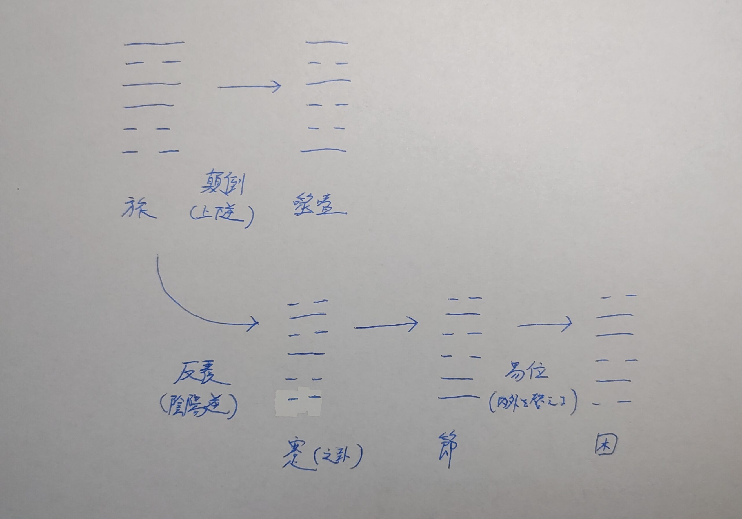 (天地否の三爻はどうなったの……と思うかもですが、真勢中州って、そういう不整合性はあまり気にしないで、文脈に合っている方だけを取ることが多いです。あと、天地否から火山旅は交代生卦、火山旅からの対策は顛倒&反覆生卦みたいに、いくつかの生卦法を混ぜることも多いです)