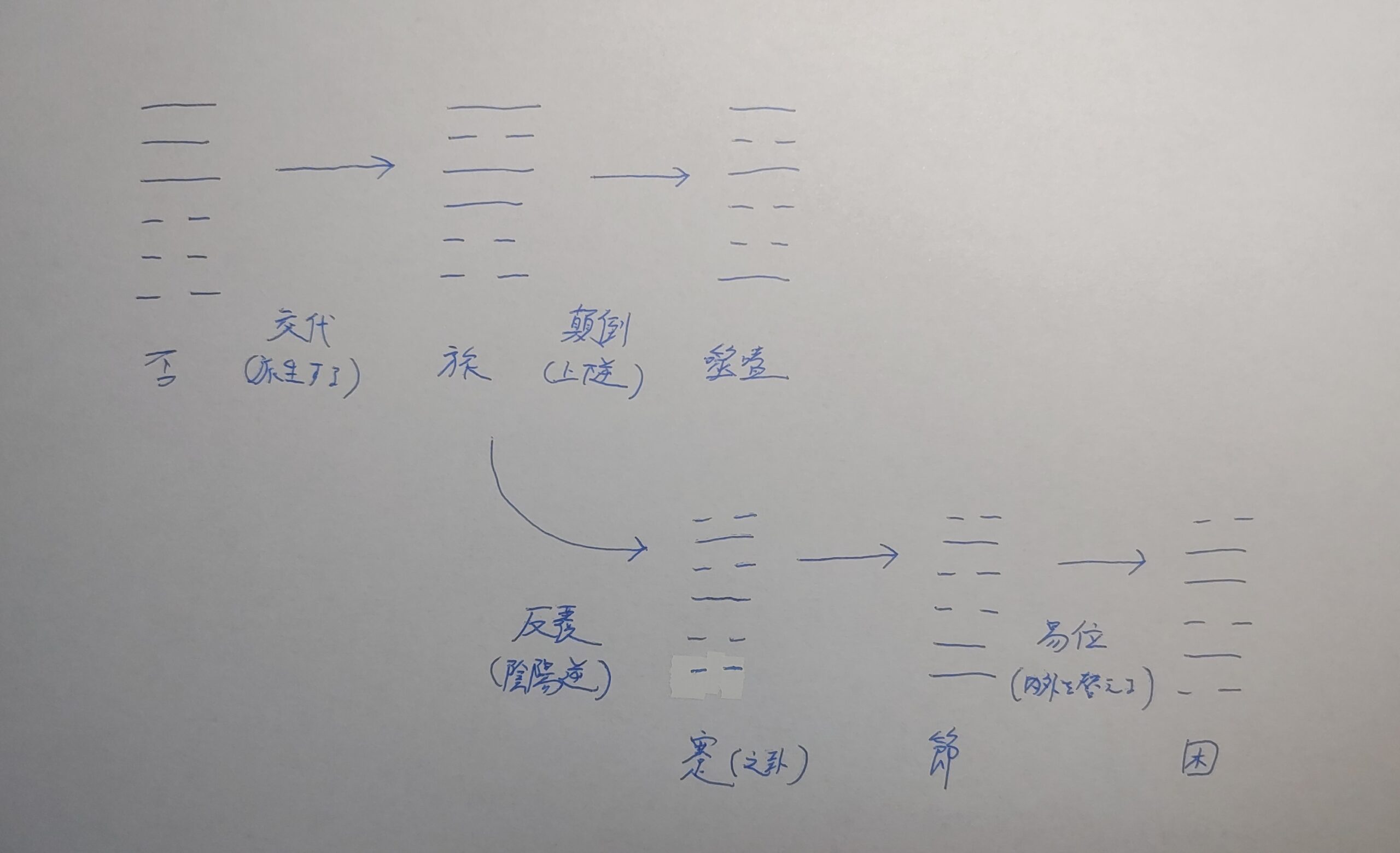 さらに、山風蠱の彖伝「剛上而柔下(陽が上がって、陰が下る)」は、地天泰の下卦から陽をひとつ上げて、上卦から陰をひとつ下ろしたもの――としています(こういう解釈は、中国でも唐・李鼎祚『周易集解』、北宋・蘇軾『東坡易伝』などにもあります)